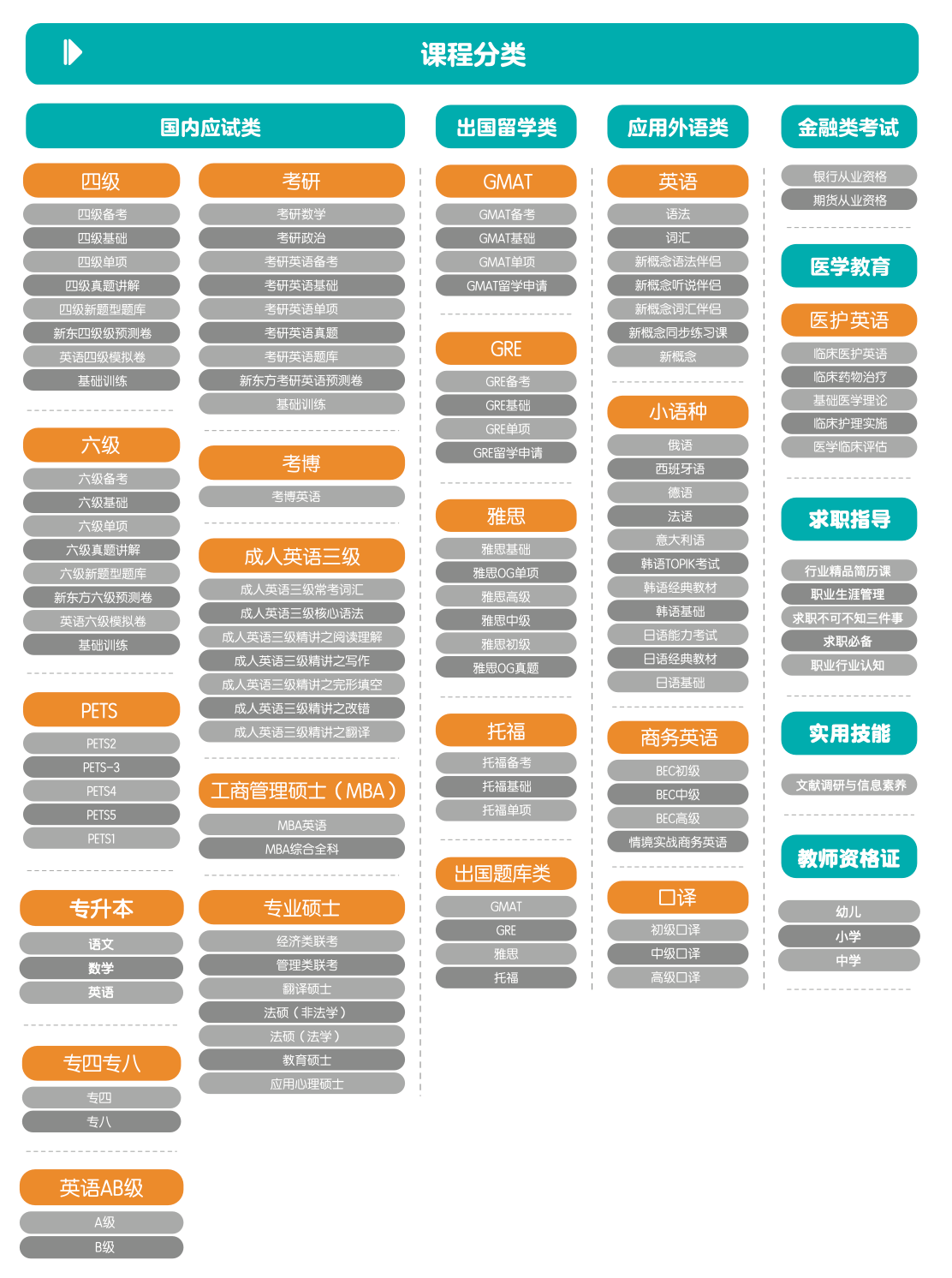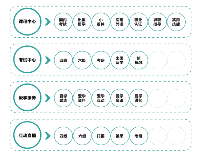 新东方多媒体学习库满足应用外语、职业认证、实用技能、学历提升、职场晋升等需求,同时将平台划分成:课程中心、考试中心、爱学服务和互动直播。