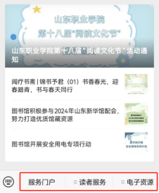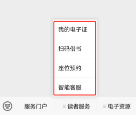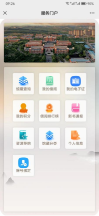 1.点击服务门户,可以进行馆藏查询、资源荐购、账号绑定,查看我的借阅、我的电子证、我的积分、借阅排行榜、新书通报、馆藏分类、个人信息等。