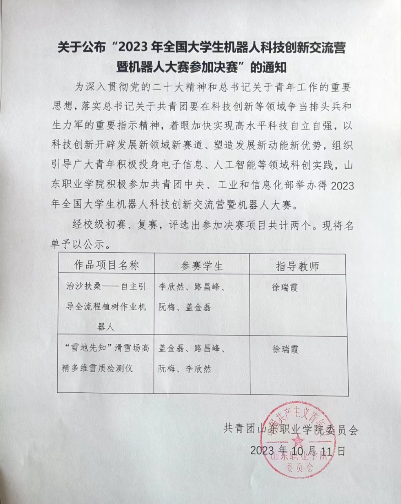 关于公布“2023年全国大学生机器人科技创新交流营暨机器人大赛参加决赛”的通知