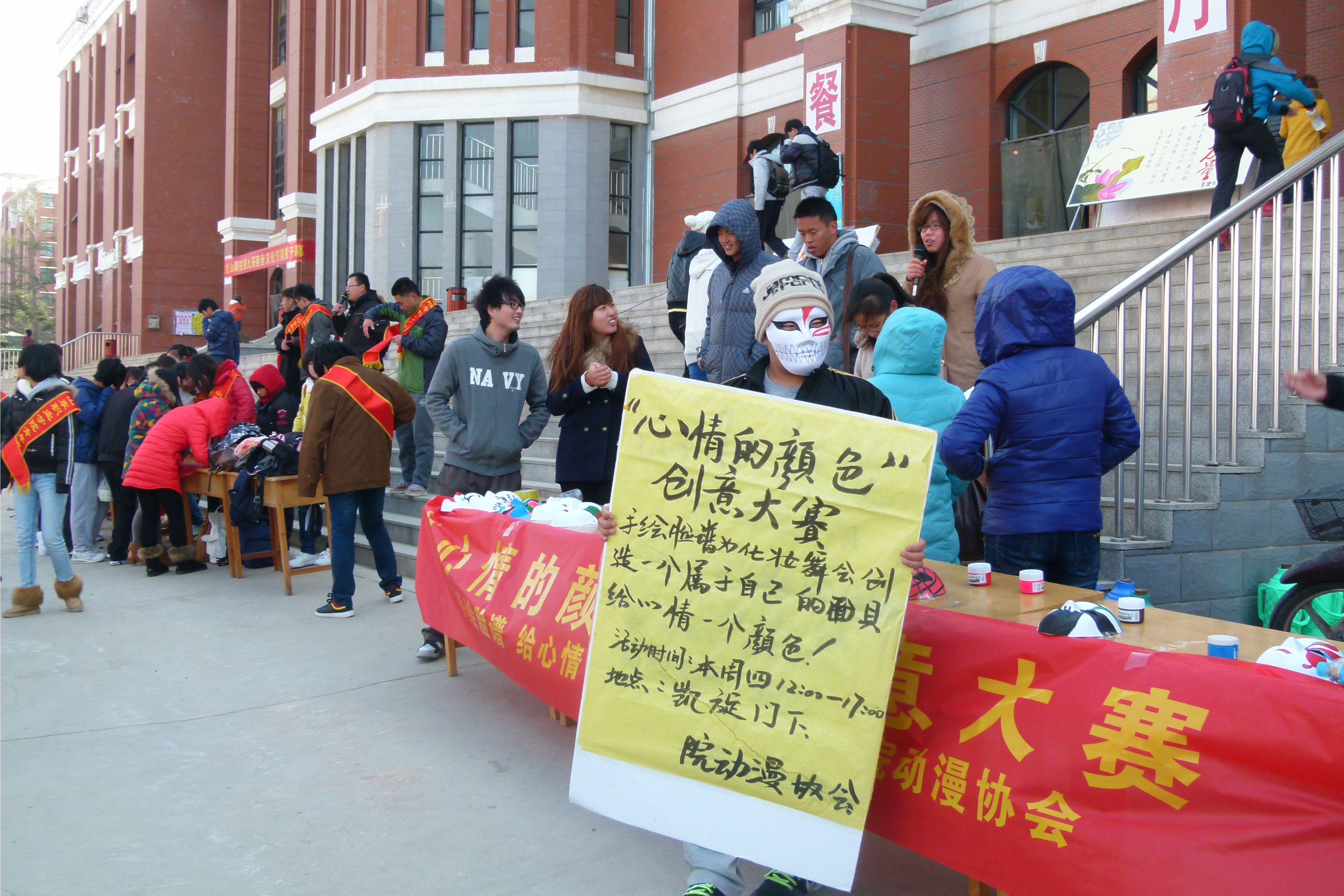 为丰富大学生校园的文化生活,营造传统与现在文化相结合的气氛;12月5日,院动漫协会举办了以“手绘脸谱,给心情一个颜色”为主题的“手绘国粹脸谱创意大赛”。