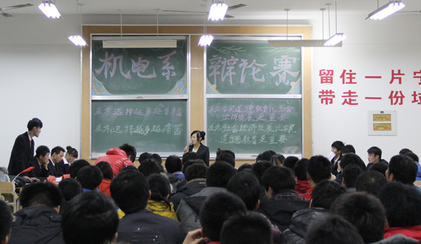 辨出风格,辨出风采。近日,机电装备系举办“博弈”辩论赛,2012级各专业代表组成团队,分别就“可供选择的越多越幸福还是越痛苦”和“公民道德教育与社会经济发展的哪一个更重要”两辩题展开唇枪舌战。