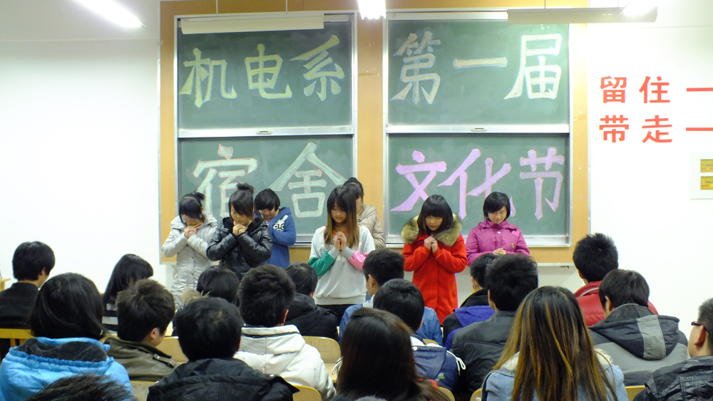 晚会在6202宿舍的一首《缘分》中拉开帷幕,各宿舍成员分别向同学们展示各自的才艺,双节棍表演、女子耍大刀、迈克尔杰克逊经典的鬼步舞和激情澎湃的合唱《我的好兄弟》赢得全场一片掌声。7501女生宿舍为同学们带来的手语操《感恩的心》引起全场欢呼,而近期大热的《江南style》在男女生演绎的不同版本中,将晚会推向一个个高潮。