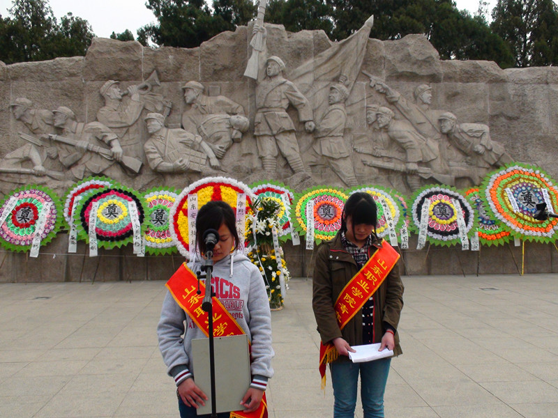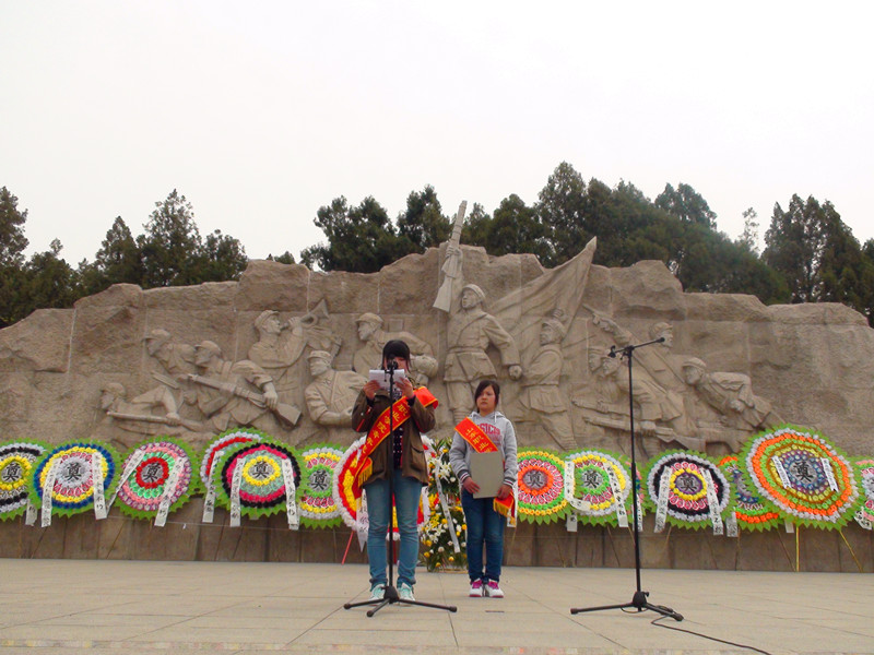 早上大家提前到达了学校的集合地点。在微风的伴随下坐着公交车来到了英雄山,到达地点后同学们并没有休息,而是直接向英雄山山顶进发。进入英雄山,同学们朗诵悼词,悼词朗诵结束后所有同学默哀三分钟,并献上早已准备好的花圈,以表示对埋葬在英雄山的烈士的尊敬。所有仪式结束后同学们前往英雄纪念馆,参观抗日战争时先辈们曾经用过的武器、住过的房子、穿过的衣服,通过参观使同学们对抗日战争时期的艰苦环境有了更深刻的认识。