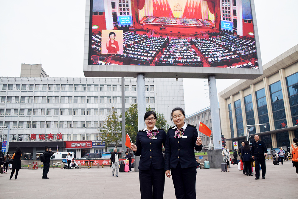 10月18日,中国共产党第十九次全国代表大会在北京开幕。济南火车站在广场大屏直播十九大开幕盛况,电视直播吸引了近千名旅客驻足观看。铁道供电与电气工程系红蓝青青年志愿者协会志愿者在现场与游客及附近的居民共同观看了十九大开幕盛况。