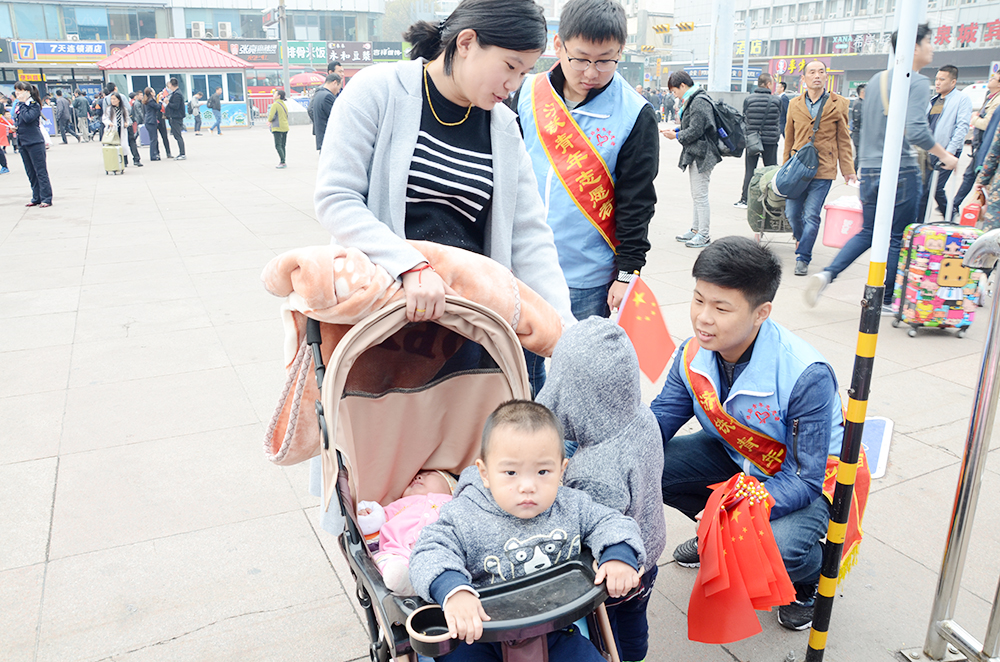 青年志愿者们积极维护广场秩序,让旅客们有序观看十九大开幕盛况,并为旅客发放手持国旗和国旗贴,营造喜庆氛围。志愿者与游客们挥舞着国旗,唱着国歌,谈祖国发展,谈身边变化,谈幸福生活,谈未来憧憬,脸上洋溢着自豪与骄傲。志愿者与旅客还将“国旗贴”贴在自己的胸口上,齐声说道“一心向党,不忘初心跟党走”,并伸出大拇指为祖国加油点赞。