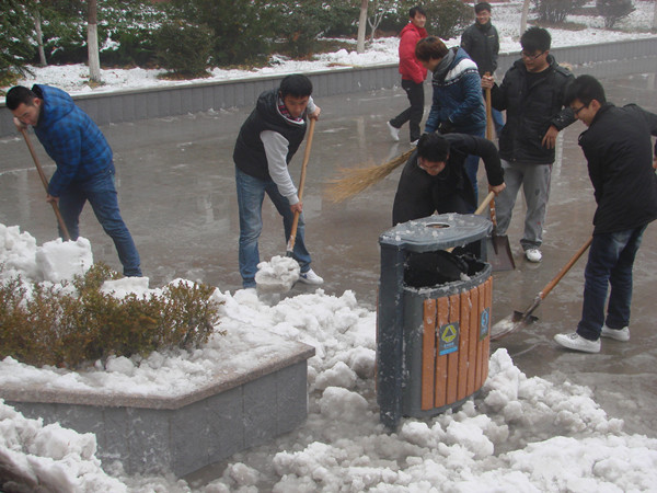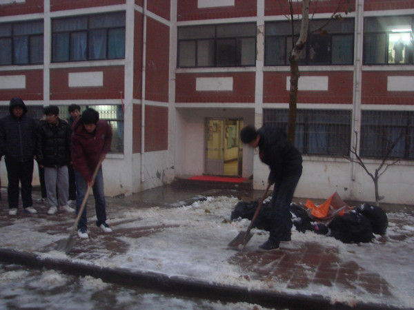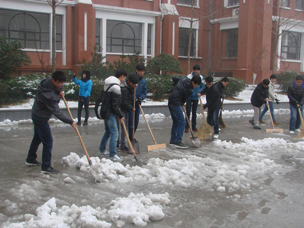 虽然天降小雨,寒风刺骨,但也无法阻挡志愿者们的热情。众多志愿者分为三队,为管理系教学楼前、管理系超市门前及宿舍楼前清扫积雪。清扫现场,志愿者们的热情高涨,双手冻红了,鞋子和裤脚也被雪水溅湿了,但他们毫无怨言。铁掀撞击路面声,合作号子声,志愿者相互鼓励声奏响了校园最动听的乐章。经过大约一个小时的奋斗,路面积雪清扫完了,师生行走安全了,志愿者们也受到了广大师生的称赞。