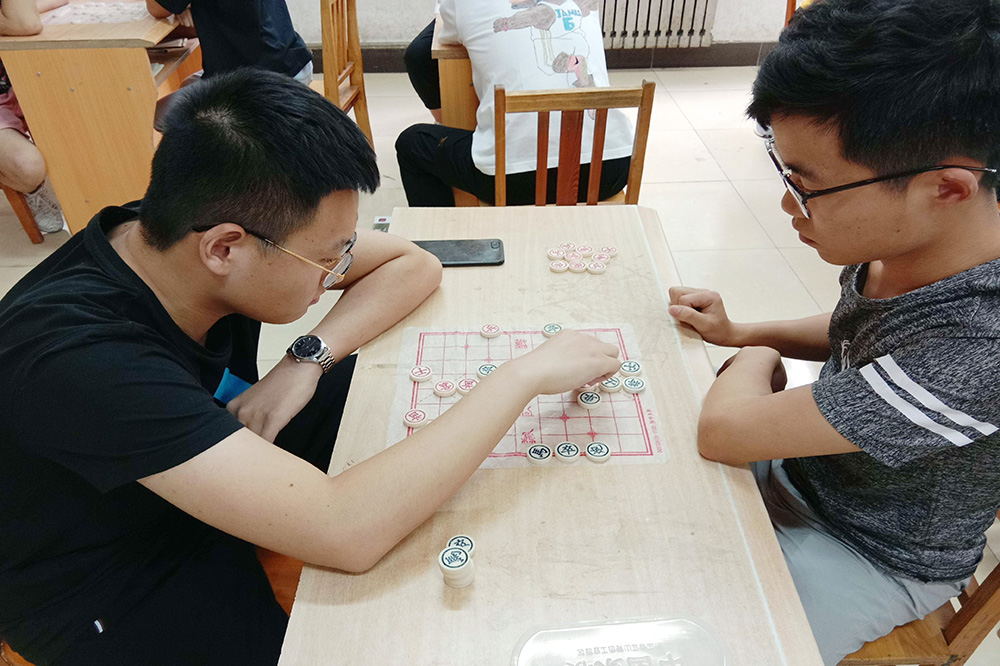 本次比赛同学们积极参加,热情高涨。初赛每种棋类分开比赛,采取一局一胜淘汰制,败者淘汰,胜者晋级下一轮,直至决出该棋种前八强,抽签选举对手,采取三局两胜淘汰制,四强选手晋级决赛。裁判一声令下,激战开始。其中一队五子棋选手落子如飞,显然是准备充分,成竹在胸;另一盘象棋更是杀得好不热闹,双方横马跳卒,车攻炮轰,你来我往,难解难分;围棋选手则以安静的姿态用旗子在棋盘上敲出美丽的音符。