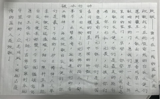 本次活动以手抄报,音频,视频,海报,文字等多种形式开展。经过精心准备,为大家营造了参赛的良好氛围。同学们积极参加活动。为疫情下的人们送去温暖的问候。本次评选活动也展现了同学们对疫情的关心和对抗疫人员的敬畏之情。最后大赛设置了特等奖,一等奖,二等奖,三等奖的奖项设置。获奖名单如下所示: