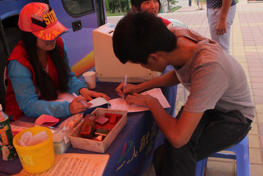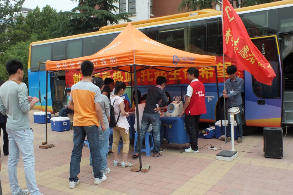 上午10点,两部采血车刚驶入活动现场,就被踊跃奉献爱心的同学团团围住。作为省级表彰的优秀服务队,机械工程系志愿服务队在活动中主动承担起了采血服务任务。排队等候期间,有许多同学因初次献血导致心理过度紧张,志愿者们面带微笑耐心细致地为他们做好心理疏导,清楚地告知他们献血要求及注意事项,并引导他们完成填表、登记等工作,保证了同学们顺利的完成献血工作。活动进入午后,等待献血的队伍长度仍旧未减,同学们积极献血的热情以及志愿者热情服务的工作态度为医务人员留下了深刻的印象。
