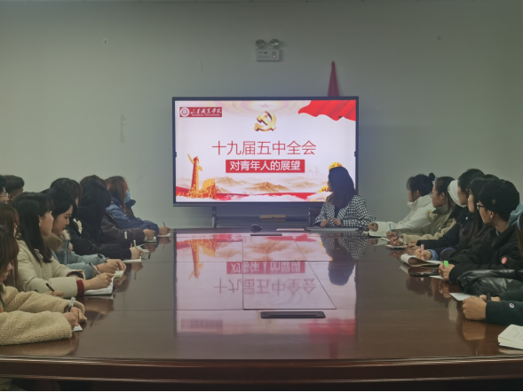 根据团省委工作部署要求,12月29日,我校共青团举行学习党的十九届五中全会精神宣讲报告会。校团委副书记宋高妮与我校学生干部代表于图书馆会议室分享了学习十九届五中全会精神的心得体会,各书院通过直播的形式学习了此次宣讲报告会。