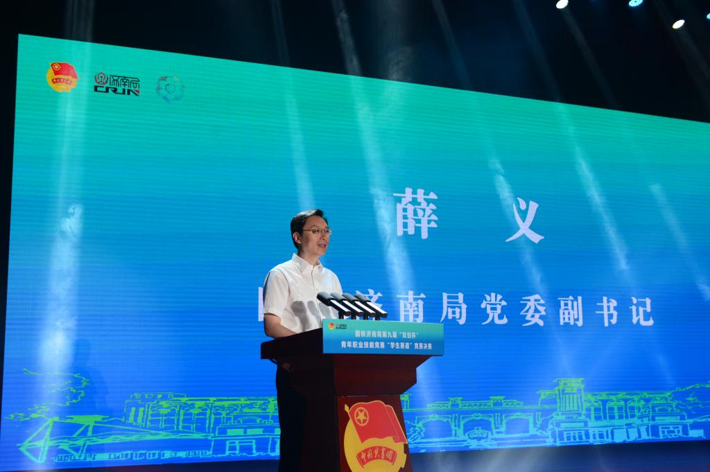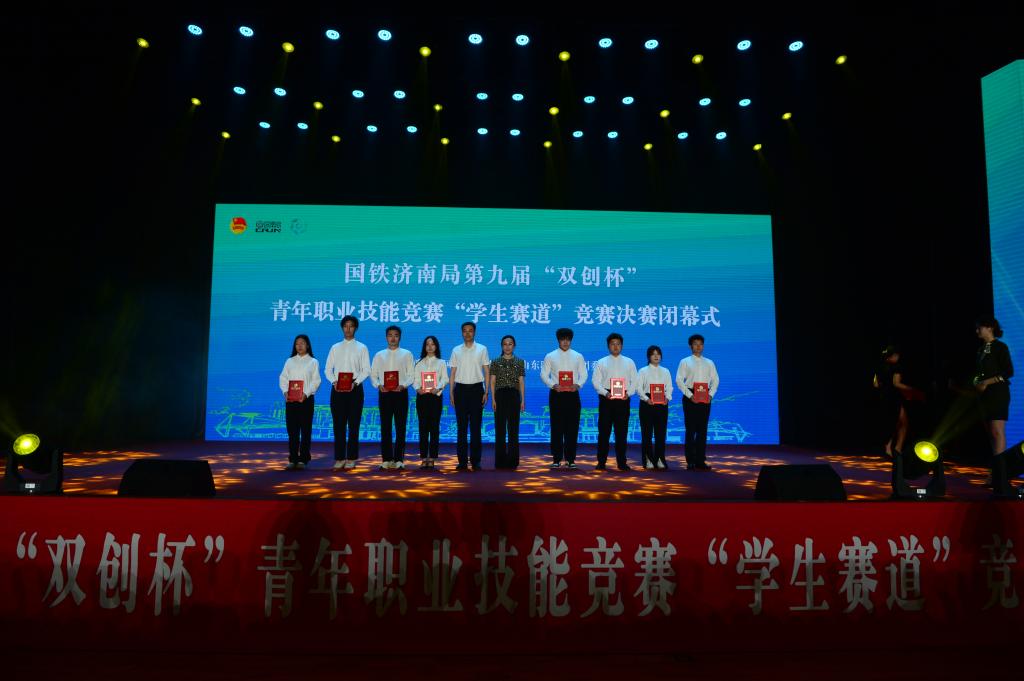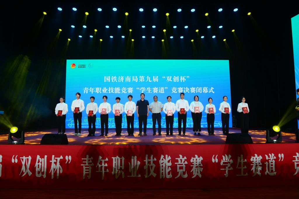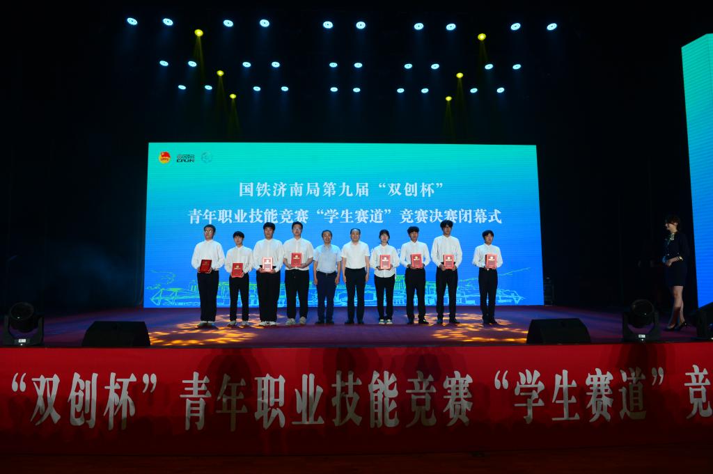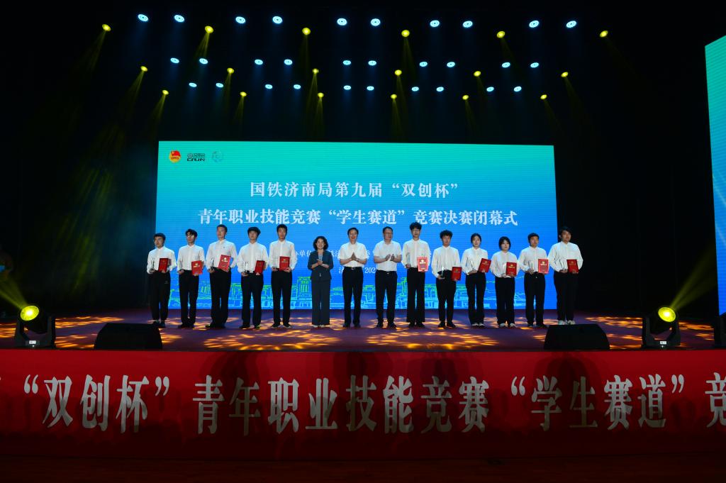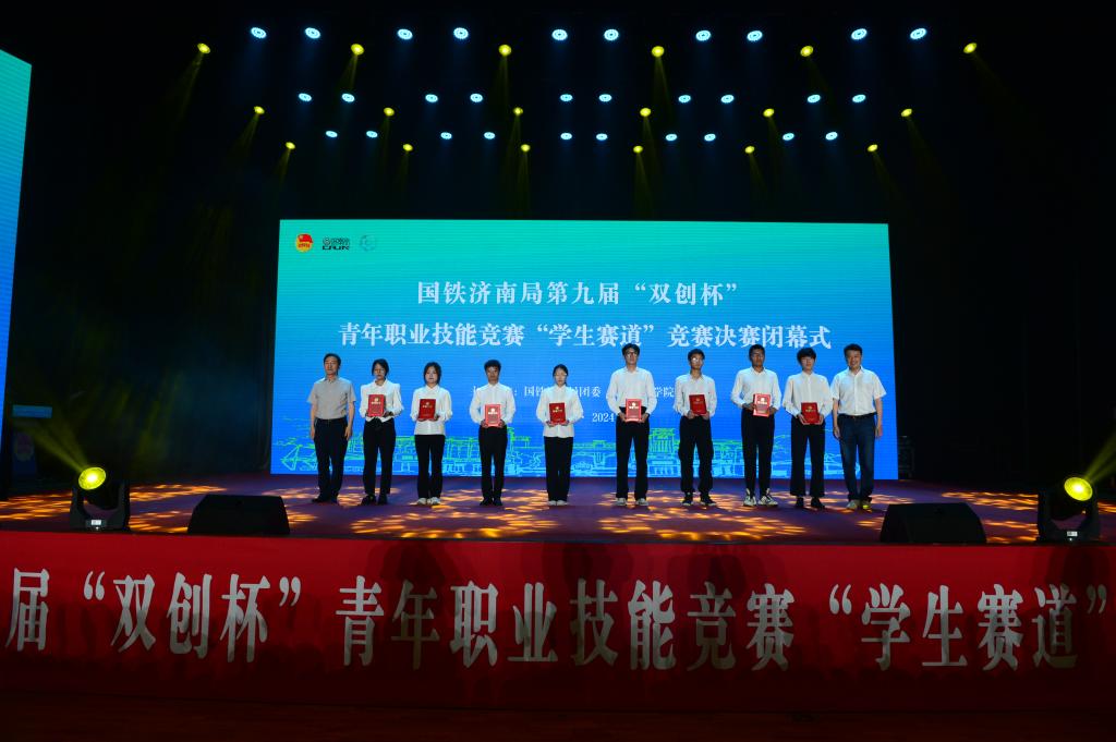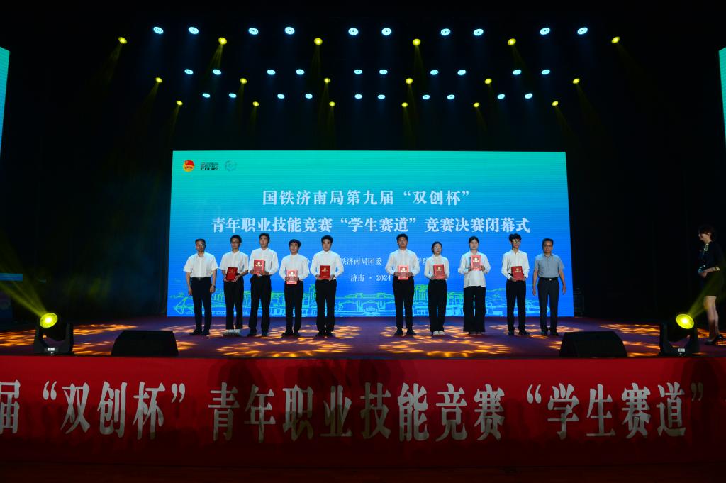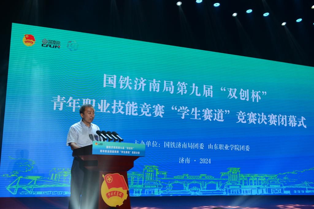 6月27日上午,国铁济南局第九届“双创杯”青年职业技能竞赛“学生赛道”竞赛决赛闭幕式在我校南益馆举行。国铁济南局集团公司党委副书记薛义、人事部副主任杜春虎、劳卫部副主任刘冠一、团委副书记安琪,球友会(中国)党委书记赵凤文、院长郭培谦等校领导出席闭幕式,学校党委副书记郭鹏主持。