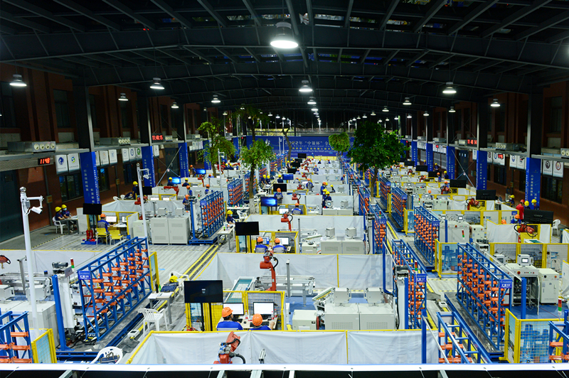 本赛项以“中国制造2025”规划为背景,针对中国制造业重点领域加速迈向数字化智能化新趋势,与世界技能大赛接轨,赛题取自工业机器人真实的工业应用场景,融合了PLC、机器视觉、自主导航AGV、工业机器人示教编程、MES、数字孪生、变频控制、伺服控制等近10种智能制造先进技术,围绕编程控制、自动搬运和装配等工作领域,用时一天半、12个小时,综合考察选手以工业机器人技术应用为核心、多种先进制造技术系统应用的能力以及临场应变、团队协作、安全生产、劳动精神、工匠精神等职业素质。