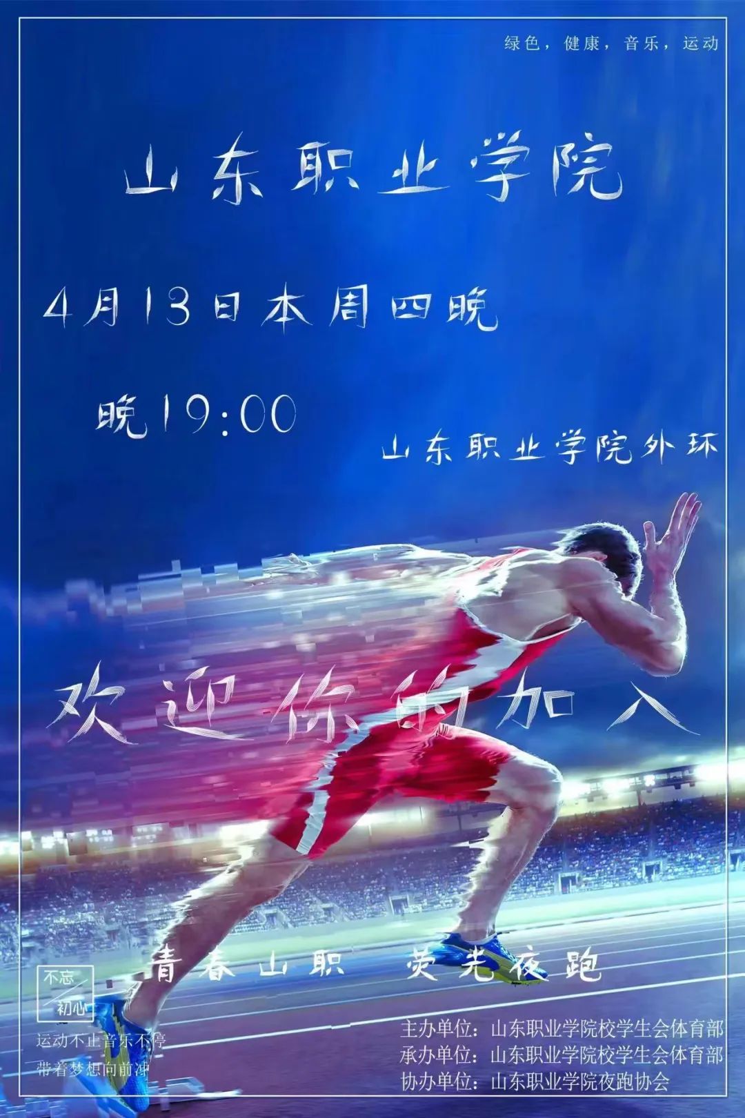 希望同学们在简单的摆臂和跨步中尽情享受跑步本身的乐趣,荧光点缀山职的夜晚,愿同学们带着满腔热情,用最激扬的奔跑,释放一天的疲惫。
