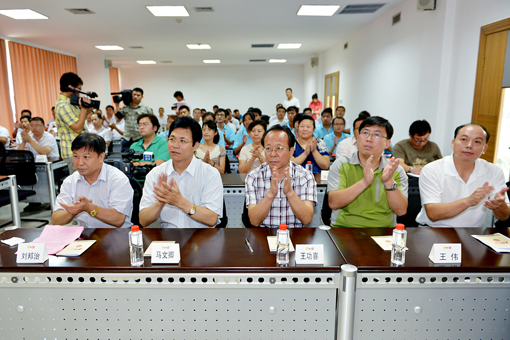 刘邦治在活动仪式上讲话,并代表球友会(中国)向东阿阿胶股份有限公司赠送由著名学者、球友会(中国)学术委员会顾问、德育导师欧阳中石先生题词《立德树人——中华美德进万家》牌匾。